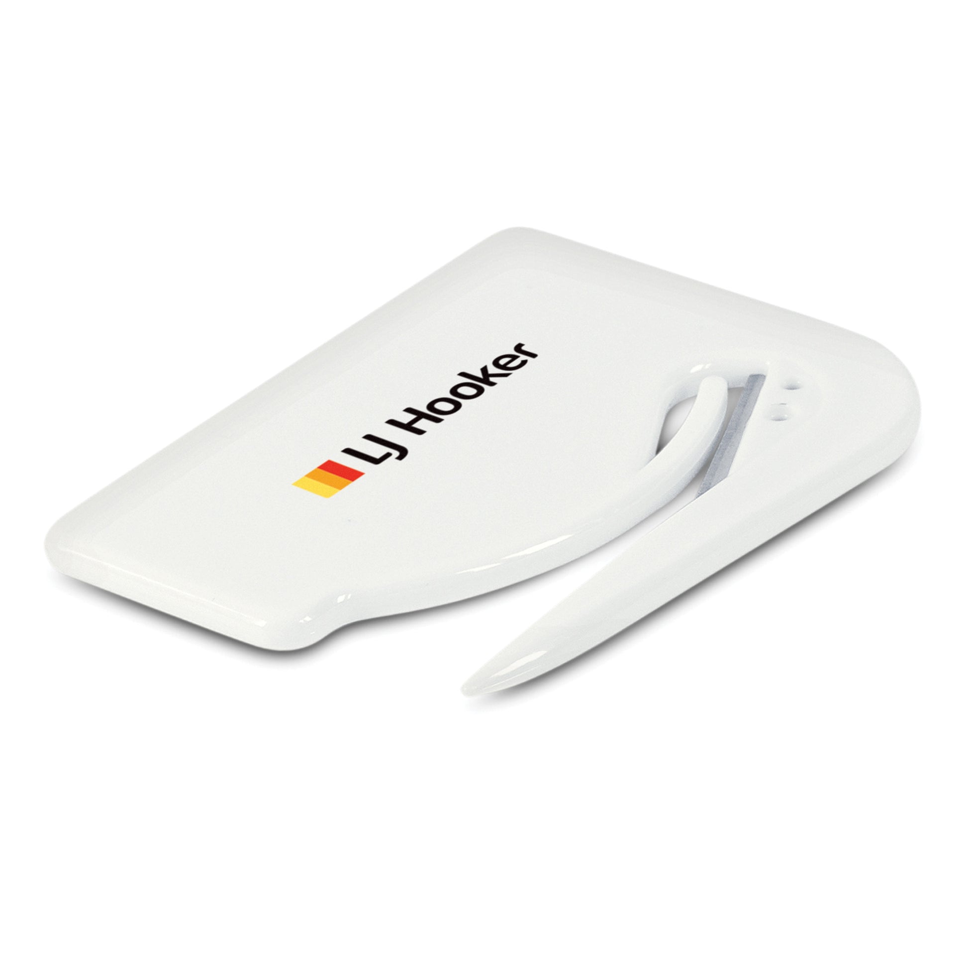 Plastic opener for letters and courier satchels which has a safe metal blade.
