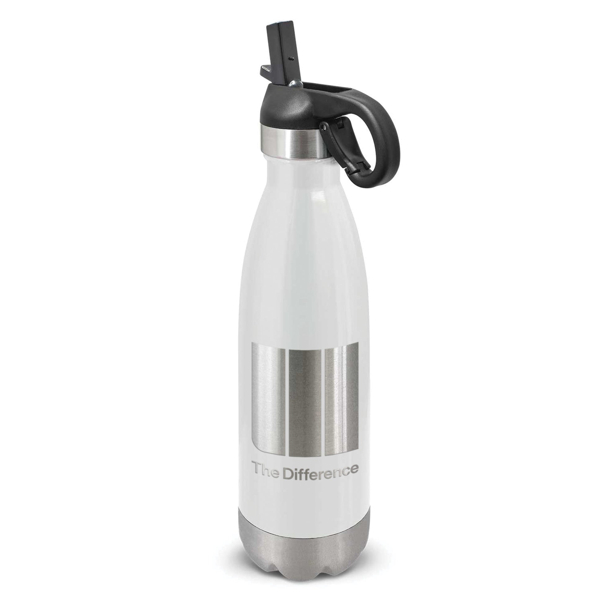 Trendy 500ml double wall, vacuum insulated stainless steel drink bottle with a timeless design. It will keep drinks cold for 24 hours. It has a secure flip valve lid which has a removable food grade silicone mouth piece for cleaning, a drinking straw and a convenient carry handle with a spring loaded carabiner clip. Mirage laser engraves to a shiny steel finish except for the silver bottle, which engraves to a natural etch. Mirage is nicely presented in a black gift box. This product is not dishwasher safe and handwashing is recommended.