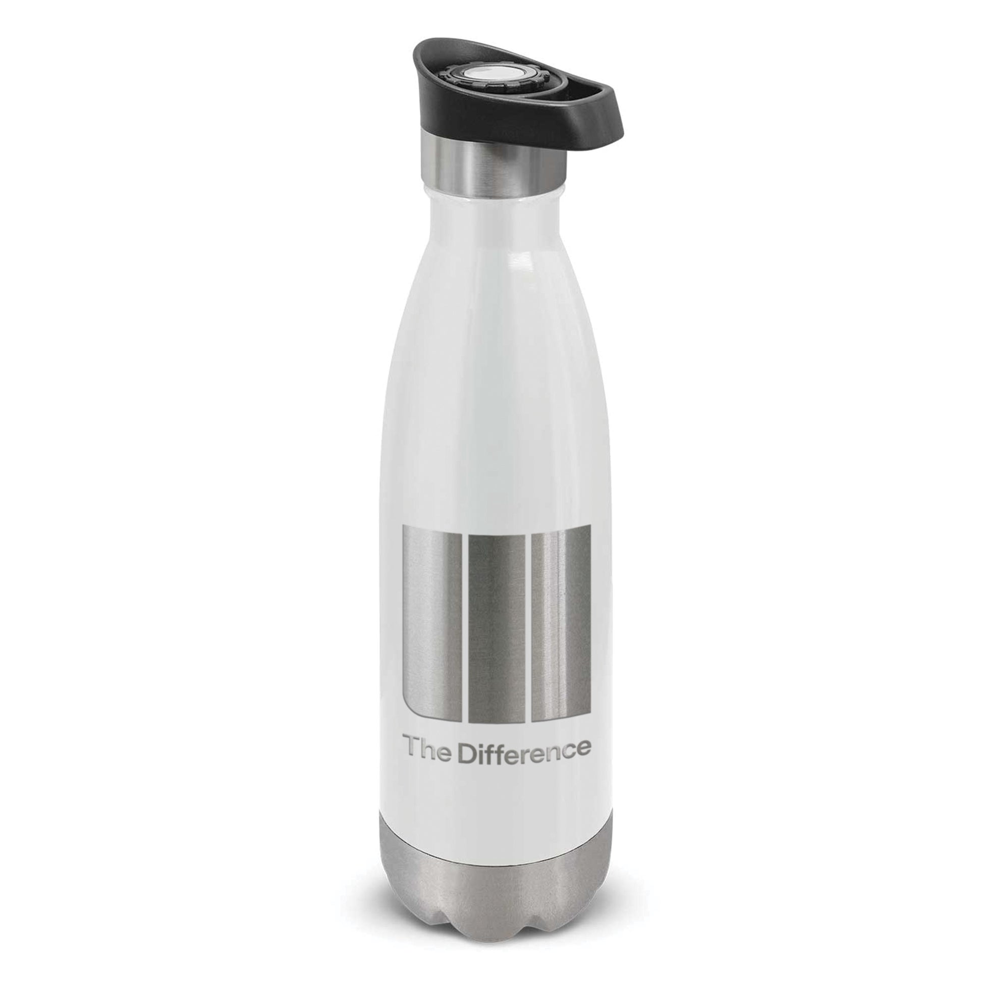 Trendy 500ml double wall, vacuum insulated stainless steel drink bottle with a timeless design. It will keep drinks cold for 24 hours or hot for up to 12 hours. It has a secure, spring activated push button lid with a carry handle and an ergonomically designed spout for pouring drinks. Remove the lid to drink directly from the bottle or simply push the button to pour. Mirage bottles laser engrave to a shiny steel finish except for the silver bottle, which engraves to a natural etch. The bottle is nicely presented in a black gift box. This product is not dishwasher safe and handwashing is recommended.