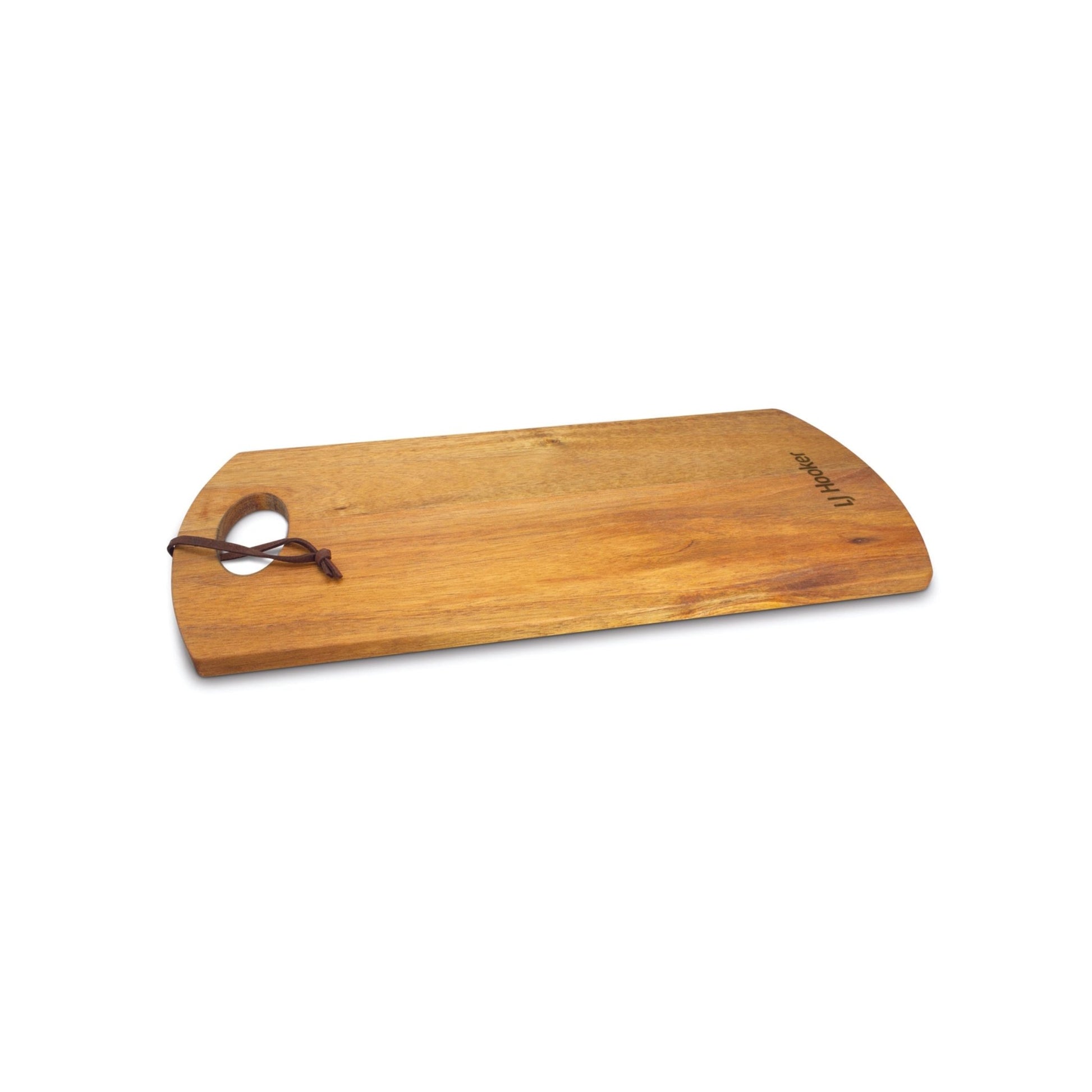 Smart serving board which is manufactured from acacia wood. It has a leather strap which can be used for hanging the board up when not in use. The serving board laser engraves to a natural etch and is beautifully presented in a matt black gift box. Wood is a natural material which produces unavoidable variances in the grain pattern, colour and branding.