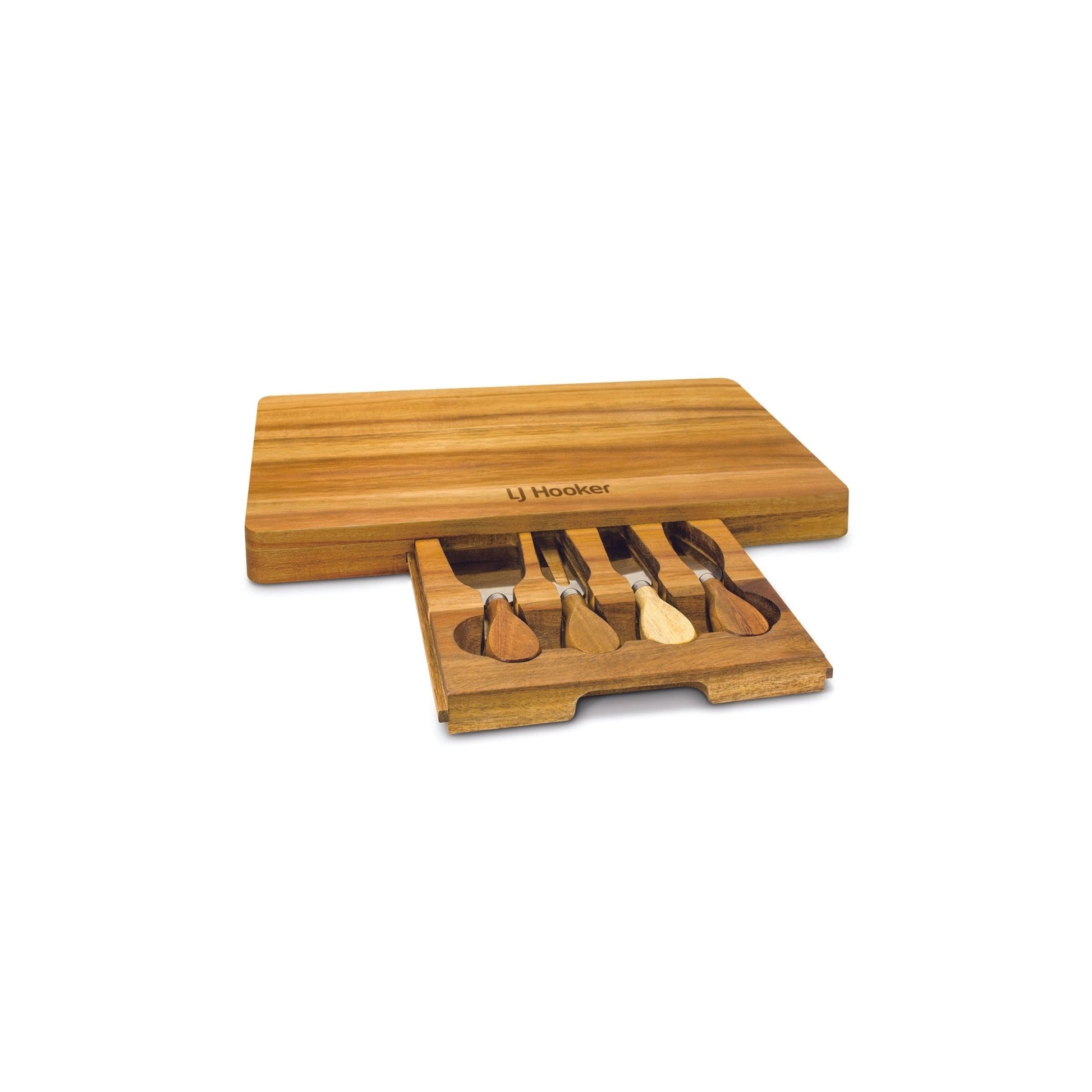 Elegant cheese board which is manufactured from acacia wood. It has four soft non-marking pads on the base and a compact drawer which opens to reveal a set of three cheese knives and a cheese fork. Montgomery laser engraves to a natural etch and is beautifully presented in a matt black gift box. Wood is a natural material which produces unavoidable variances in the grain pattern, colour and branding.