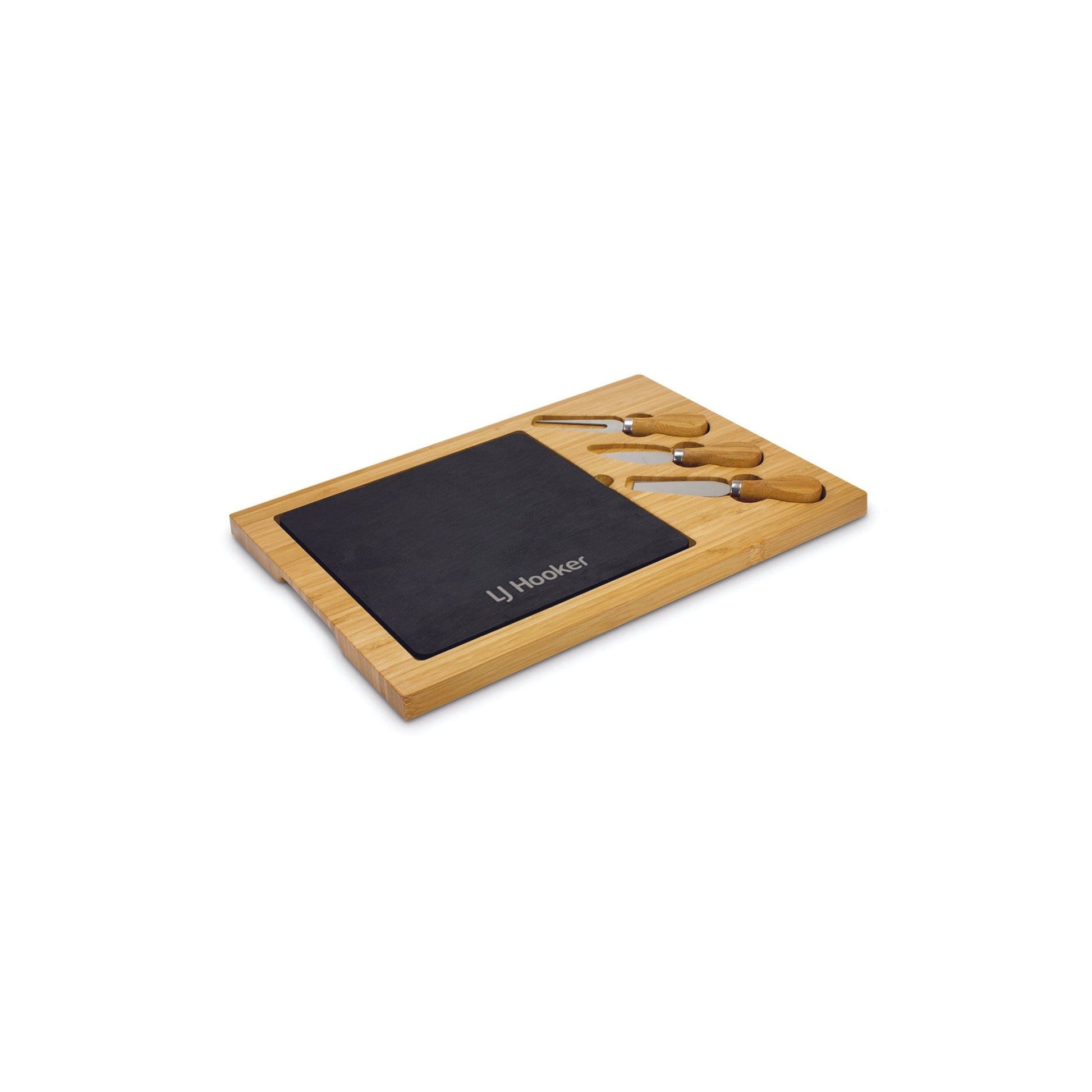Luxury bamboo cheese board with a slate insert which can be removed for cleaning. It has two cheese knives and a cheese fork with their own compartments so they are always ready for use. The slate insert laser engraves to a natural etch and the cheese board is beautifully presented in a black gift box. Wood is a natural material which produces unavoidable variances in the grain pattern and colour.