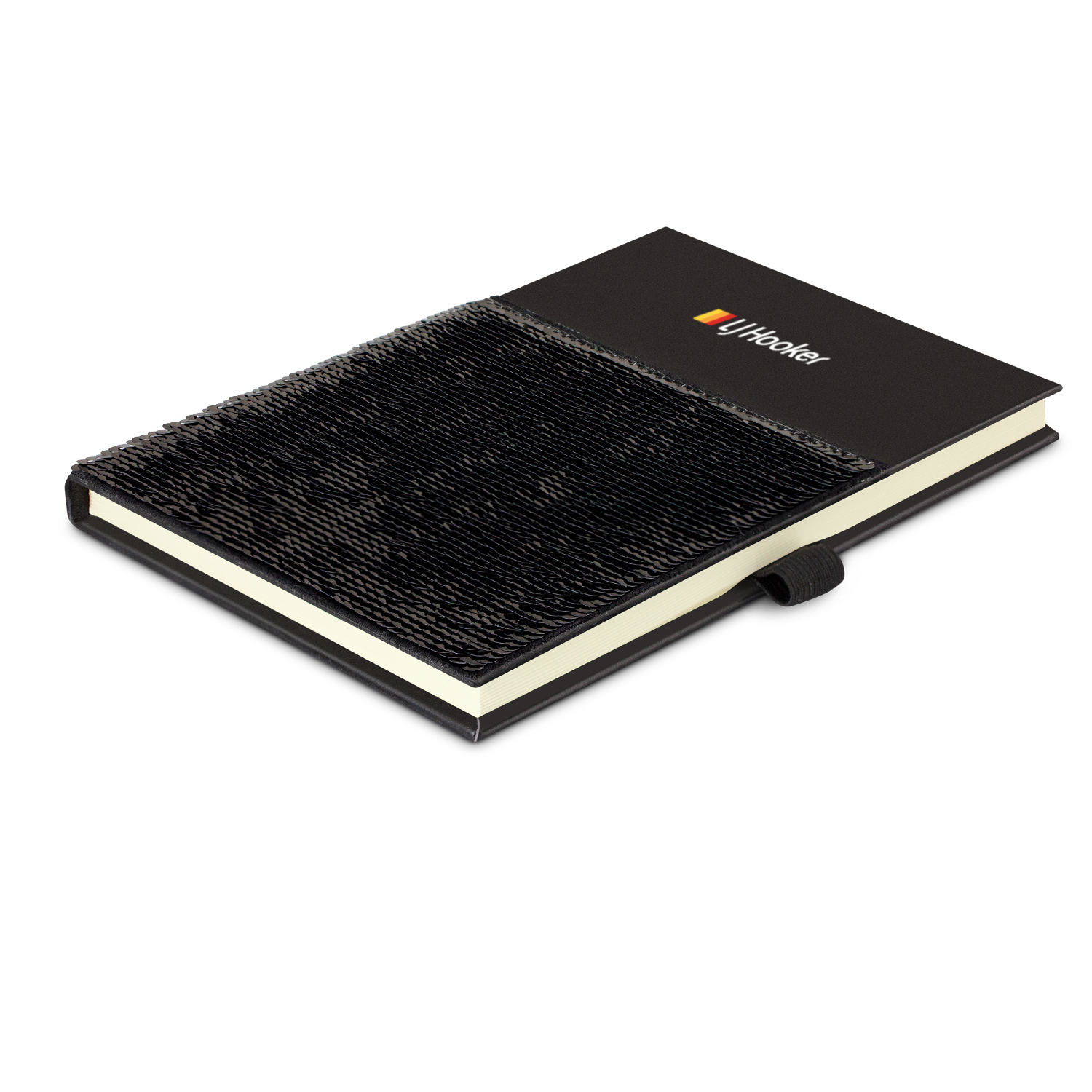 Luxury hard cover notebook with a tactile panel of reversible sequins which alternate between black and silver depending on which way they are brushed. The notebook has 80 leaves (160 pages) of 70gsm lined cream paper and features a black elastic pen loop.
