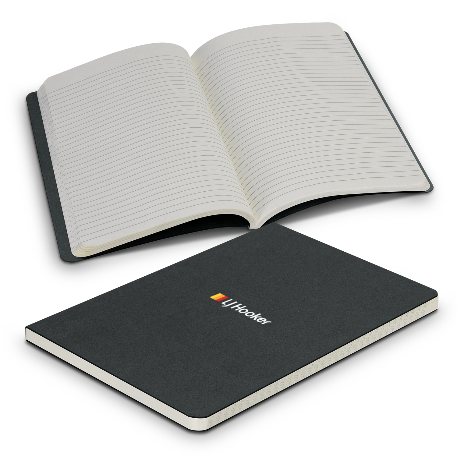 Crafty soft cover A5 notebook perfectly bound from repurposed cotton of 90-100gsm. It is composed of 50 leaves (100 pages) of repurposed cotton paper with lined cream paper and round edges.