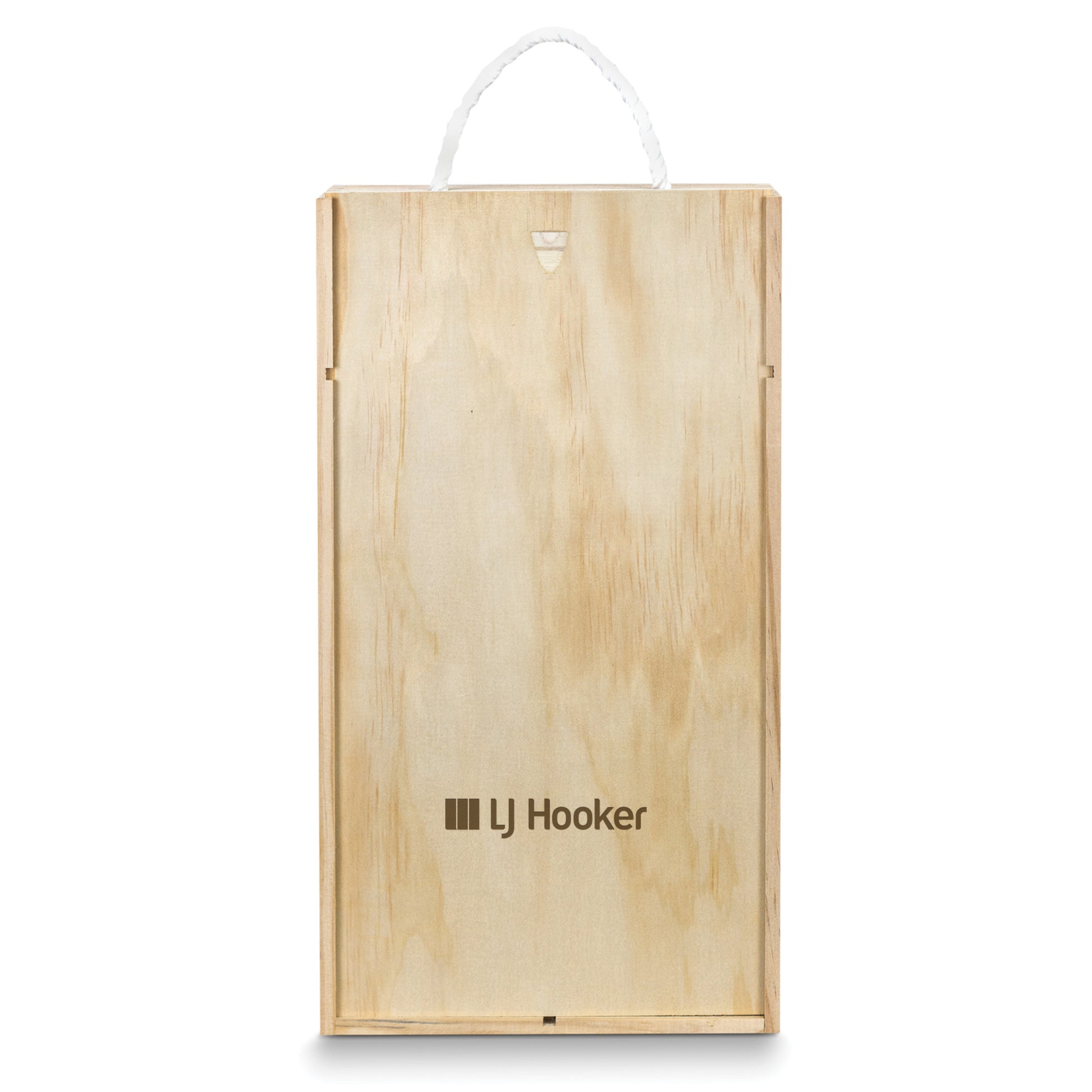 Elegant wine gift box made from natural pine wood with a sliding lid that offers a large branding area. The box is designed to hold two standard wine bottles and has built-in dividers with shredded paper filling. A woven cotton rope handle makes it easy and comfortable to carry.