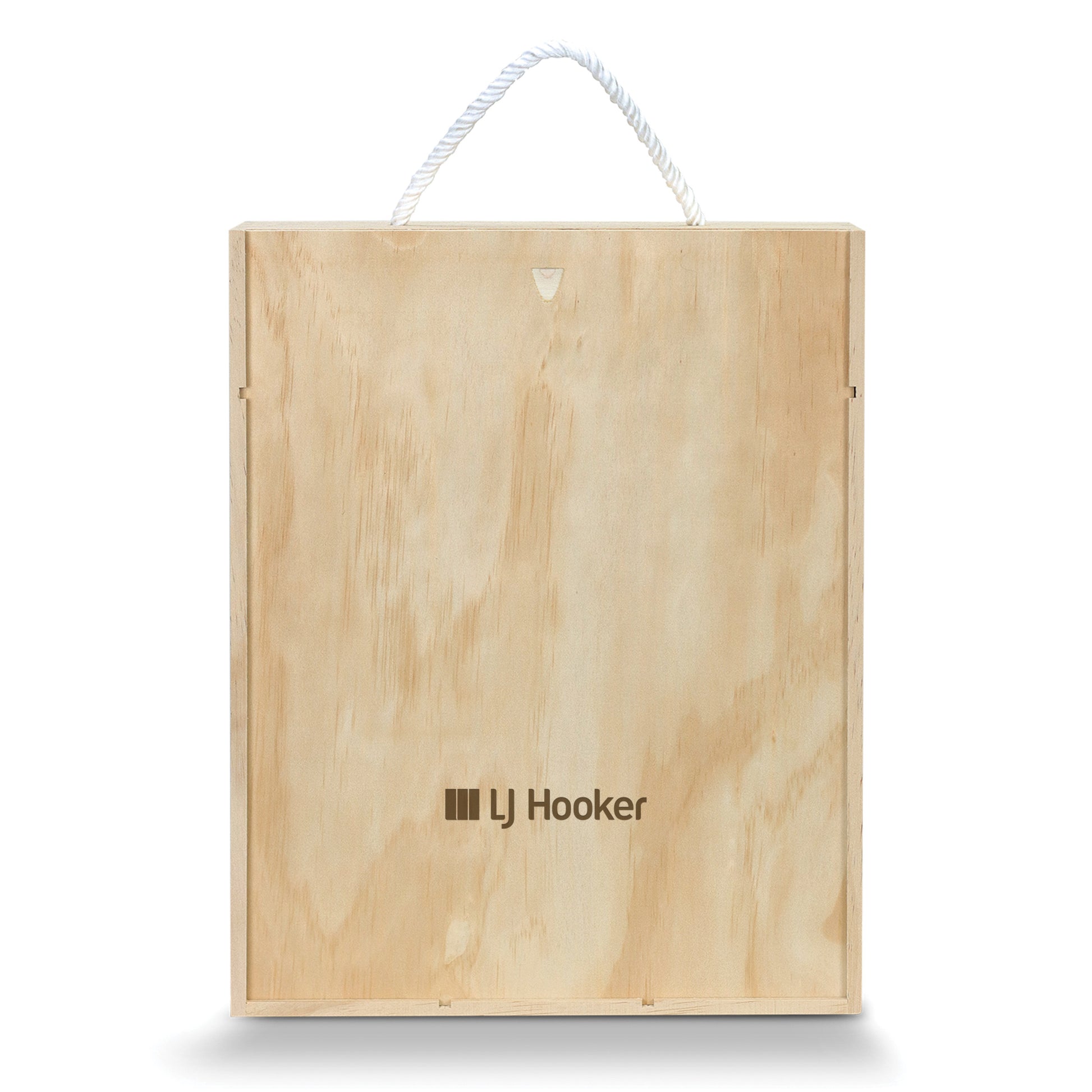 Elegant wine gift box made from natural pine wood with a sliding lid that offers a large branding area. The box is designed to hold three standard wine bottles and has built-in dividers with shredded paper filling. A woven cotton rope handle makes it easy and comfortable to carry.