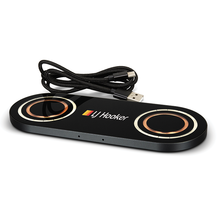 Experience the elegance and efficiency of the Arc Magnetic Dual Wireless Charger. Designed to seamlessly integrate into everyday life, this charger boasts two wireless charging pads which can be used to charge two devices simultaneously. Additional features include red and blue LED charging indicator lights, and discreet rubber feet for stability. The sleek black glass finish, refined copper accents, and quality components make this charger a standout accessory. Presented in a beautifully crafted INGENIO gift box, it is ideal for corporate gifting, and the ultimate brand statement. INGENIO - Designed to lead, built to last, made to inspire.