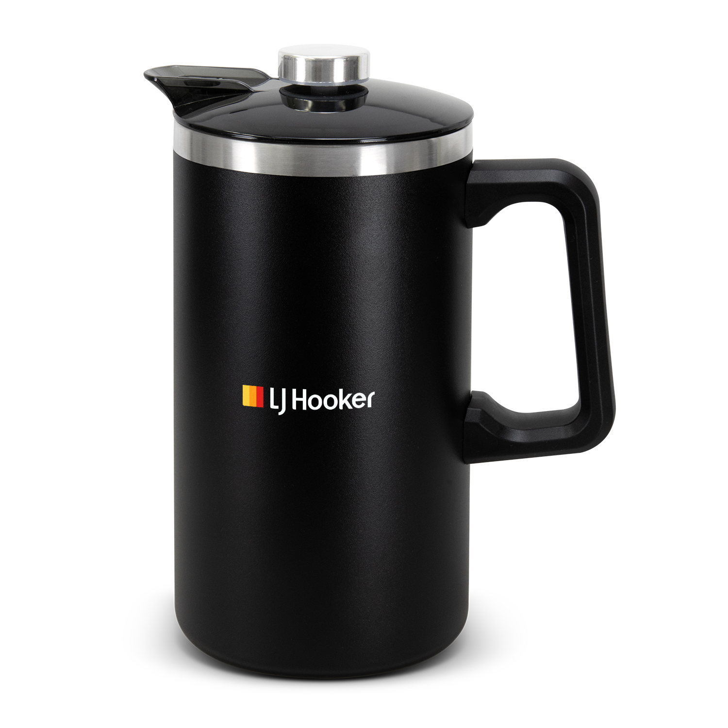 A double wall vacuum insulated coffee press from Frontier that boasts a 1.1L capacity. Designed to keep coffee hot for longer, it is made from durable stainless steel with a black powder coat finish and is ideal for home, office, or outdoor use. The precision filter keeps grounds separate for a smooth brew every time. BPA-free and built to last, it comes presented in a natural gift box with Frontier branding.