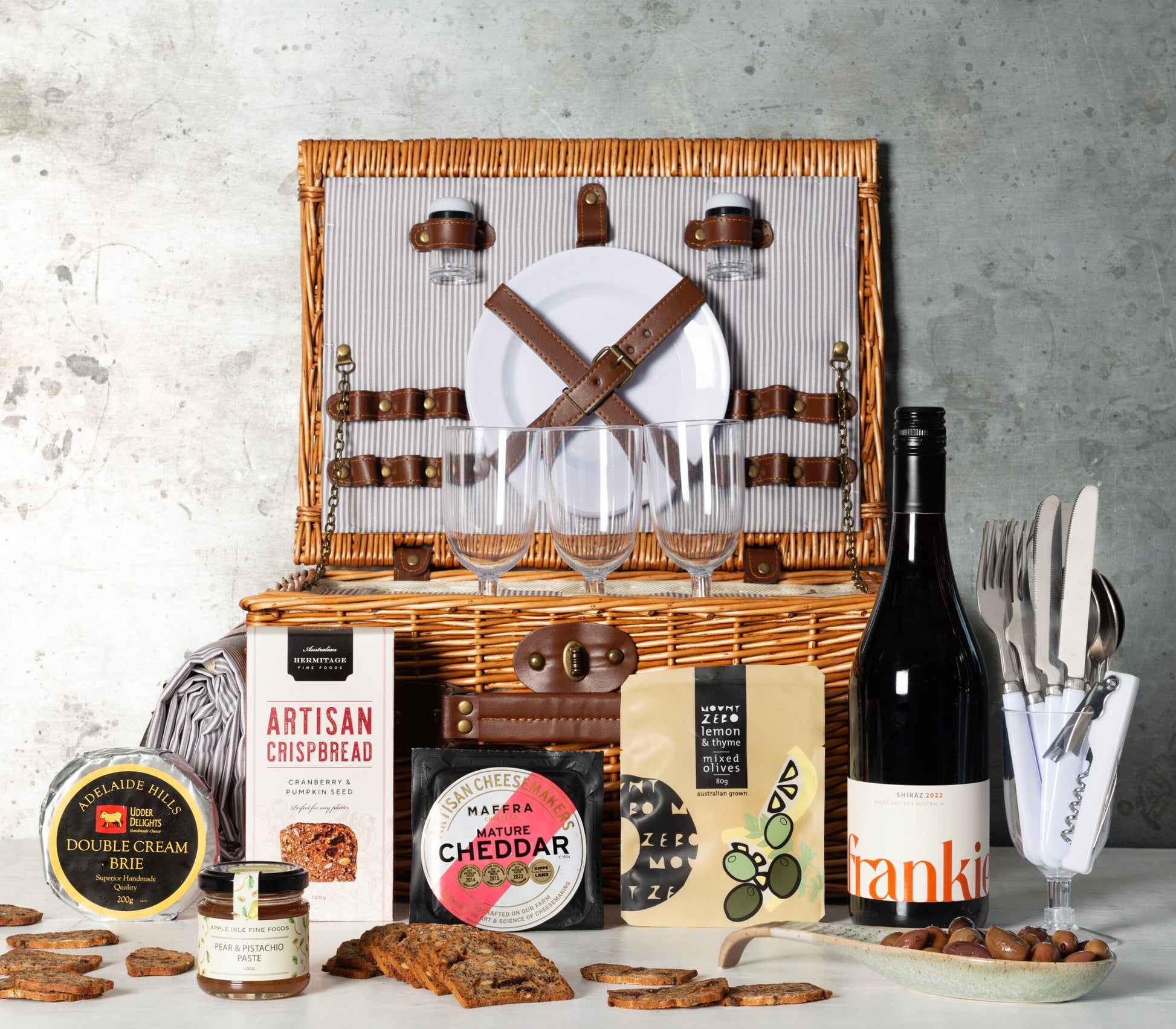 Indulge in a luxurious picnic experience with our Cheese and Shiraz Picnic Basket Hamper, meticulously curated for cheese and wine enthusiasts. Designed with elegance and convenience in mind, each hamper comes personalised with your logo on the box/basket, finished with a coordinating ribbon, and includes a personalised gift card for that special touch.